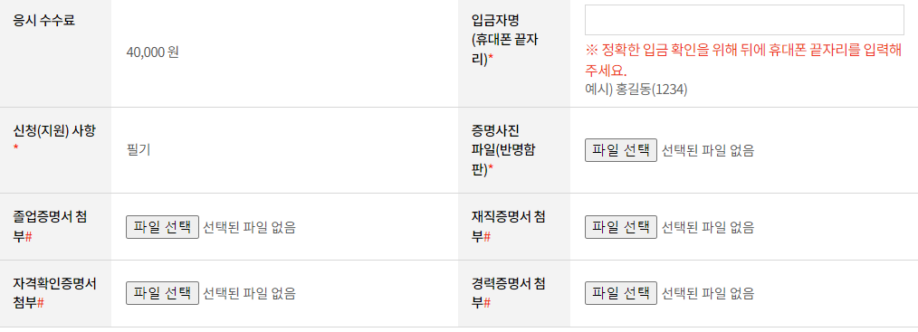 그 뒤, 입금자명과 자격확인증명서 파일을 같이 첨부하여 제출합니다. 이하 다른 증명서도 같은 방법으로 첨부하여 응시자격을 증명하시면 됩니다.